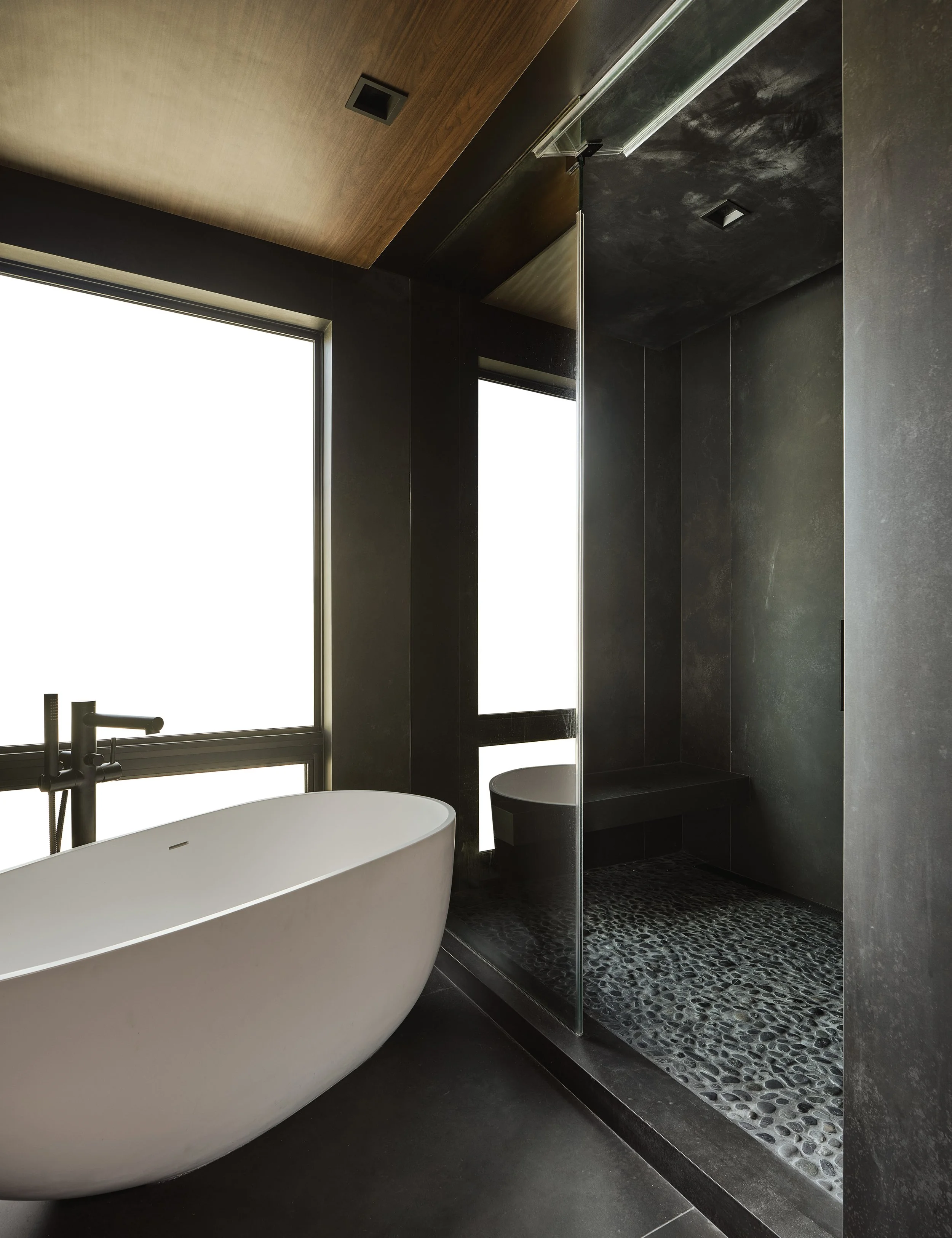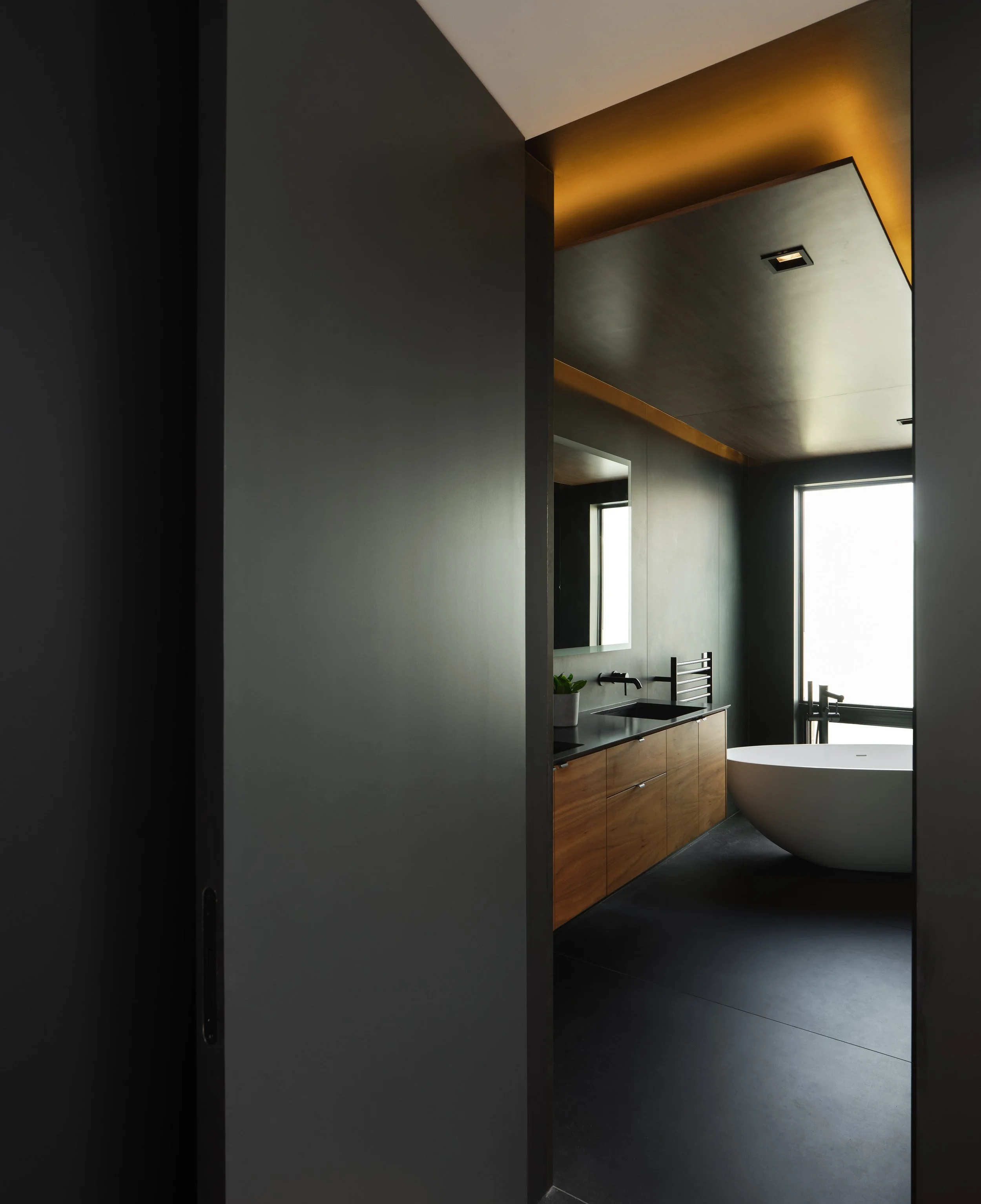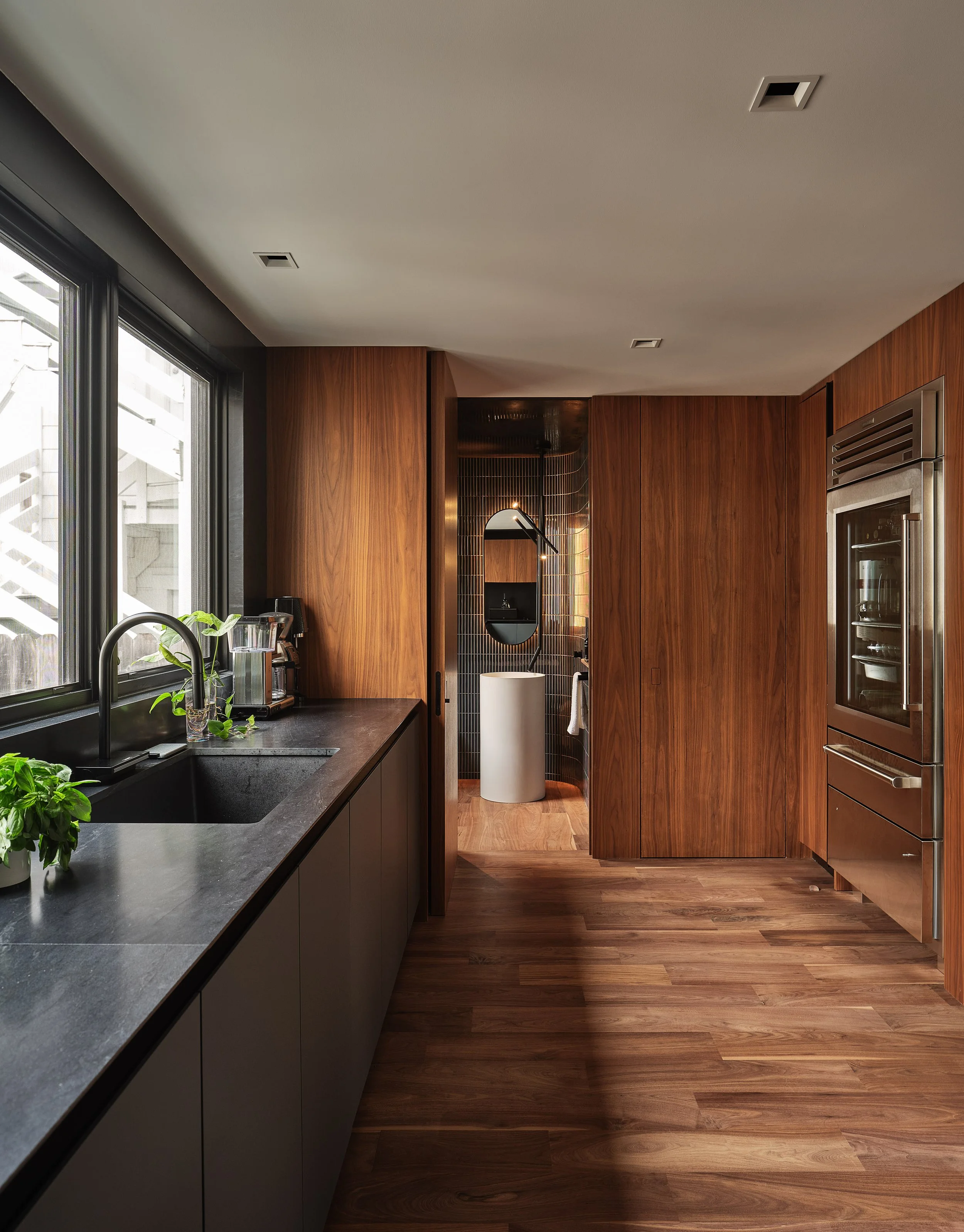 Our clients worked closely with us to turn their four-story single-family home into a contemporary delight filled with custom details featuring a natural material palette. The exterior was extended to create an enlarged foyer and garage, and upstairs patios were maximized to take full advantage of the expansive view of the City. The Caviar Black painted exterior hints at the simple yet bold architectural interiors, featuring Walnut flooring and paneling, dark natural stone and craft tile found throughout the home. The interior partitions have been reconfigured to provide an open kitchen, living and dining space with a custom wine wall to display the client’s extensive wine collection. The bedrooms and bathrooms in the floor levels above feature new wood flooring and wall panels, concealed doors, decorative stone paneling and decorative soffits for a simple, bespoke and refined interior aesthetic.