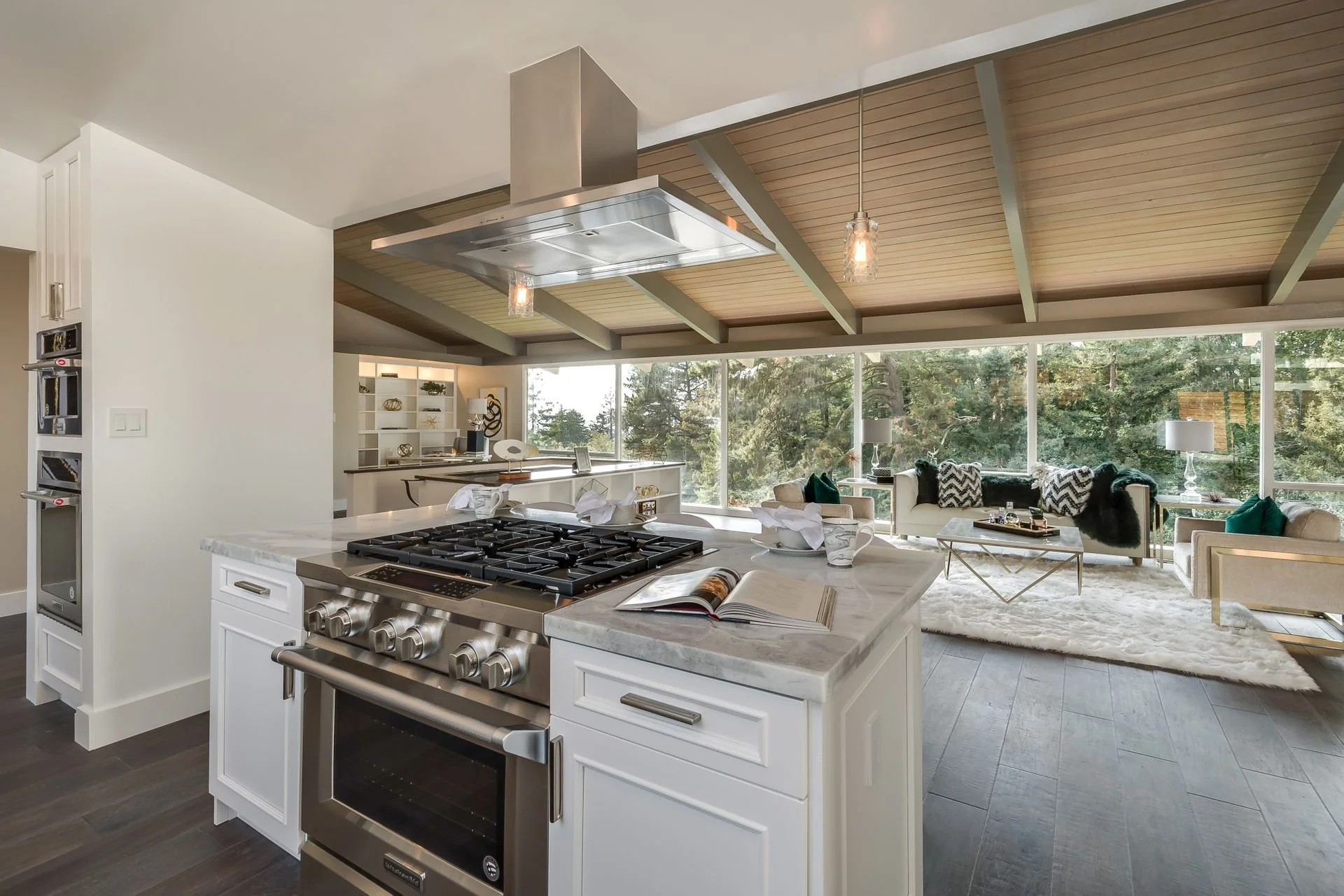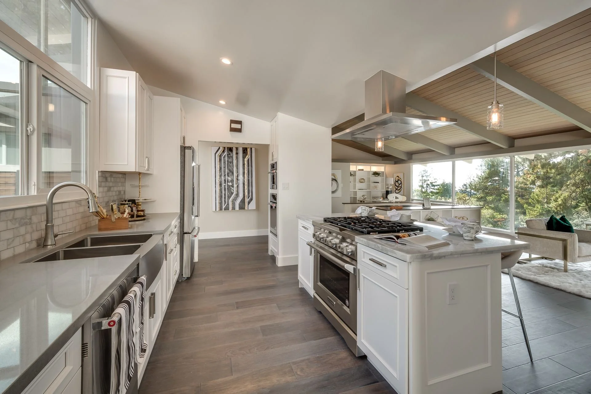 In the Piedmont Hills, this mid-century home nestles comfortably in a dense redwood grove with views of the San Francisco Bay. The modern house was renovated to feature main living areas with wonderful views and natural daylight in this iconic setting. By selectively removing interior walls at key locations, the kitchen, family room, living room, dining room, lounge, bedrooms and decks face sunrise in the east and sunset in the west.